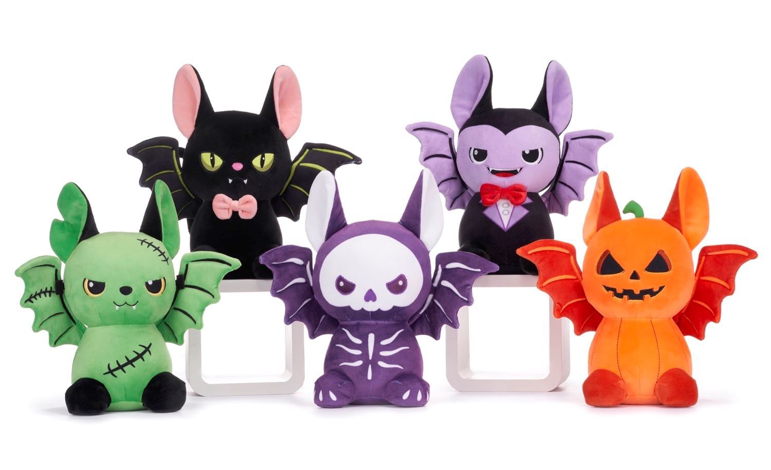 Enjoy cuddling up with these super-cute and squishy Halloween Bat soft plush toys this spooky season. There are five different Halloween Bat soft plush toys to collect and cuddle, including a green Frankenstein Bat, purple Skelton Bat, Dracula Bat, orange Pumpkin Bat and a cute black Cat Bat. All these Halloween Bat soft plush toys measure approximately 23cm in height. Suitable from birth.