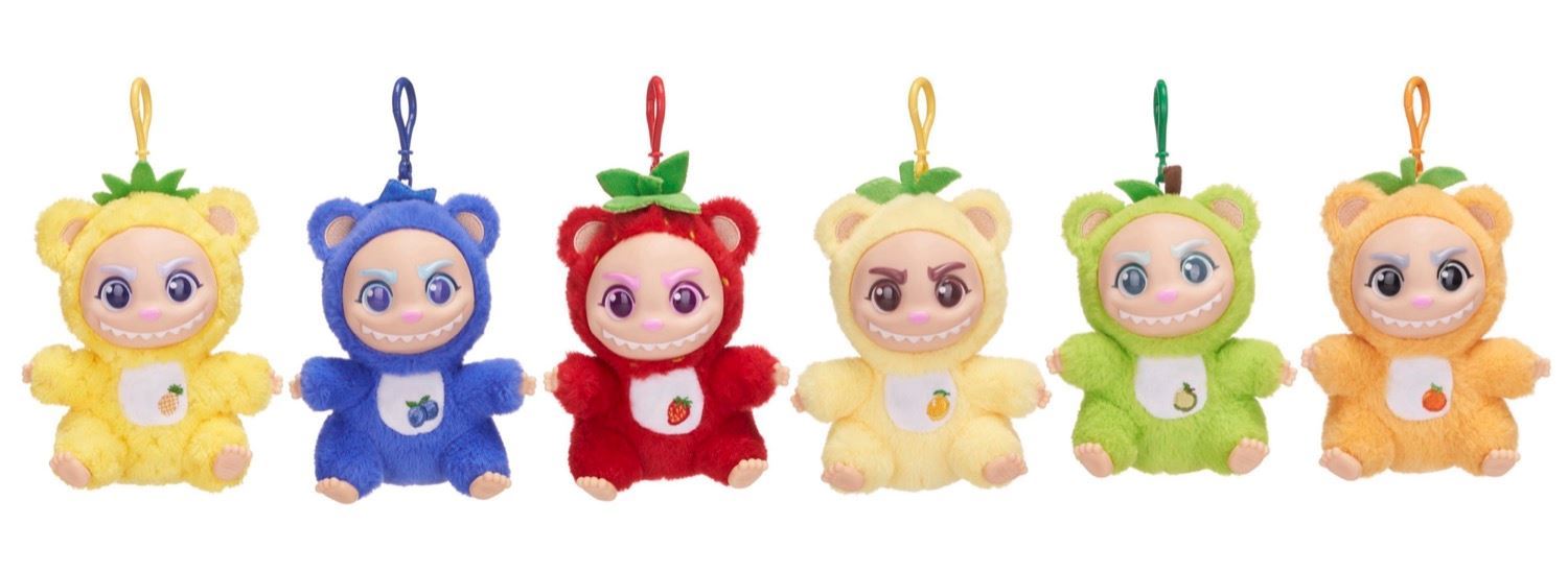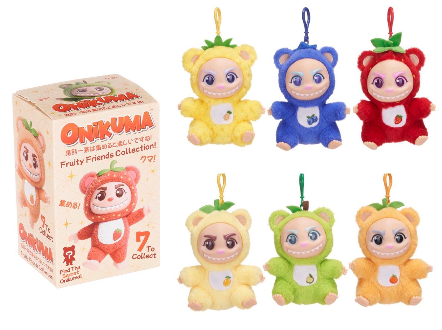Bring your bag and clothing to life with these super-cute and collectible Onikuma bear in fruit costume soft plush bag clip charms that will add a touch of fun and colour to your outfit wherever you go. There are six Onikuma bears to find and collect in these collectible blind boxes, including a bear in a Lemon, Blueberry, Strawberry, Pineapple, Pear and Orange fruity costume. Each bear has a vinyl face and a plastic bag clip that matches the colour of its fruit costume. Suitable from ages 1+.