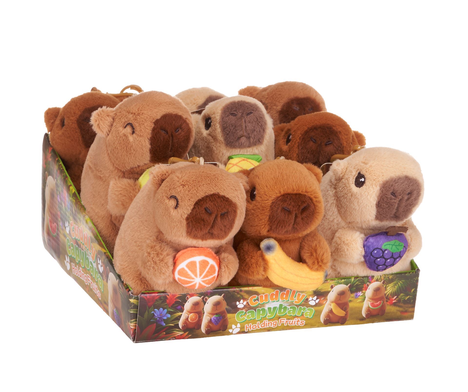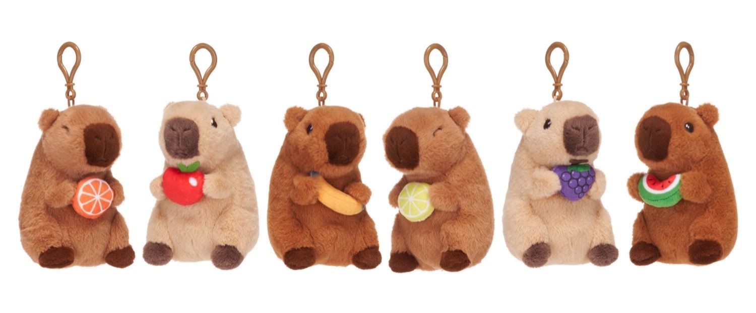 Bring your bag and clothing to life with these super-cute and collectible Cuddly Capybara with Fruit soft plush bag clip charms that will add a touch of fun and colour to your outfit wherever you go. There are six Cuddly Capybaras with Fruit to collect, including a capybara holding an orange, apple, banana, grape, watermelon and a lime. Each Cuddly Capybara with Fruit plush bag clip charms measures approximately 5” (13cm) in height. Suitable from ages 1+.